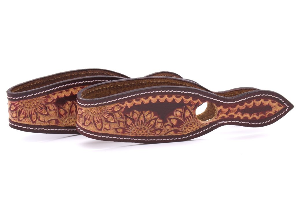 Štýlové westernové slobber strapy vyrobené z kvalitnej kože v červeno-hnedom odtieni, zdobené precíznym kvetinovým reliéfnym vzorom. Vystužené pre maximálnu odolnosť a dlhú životnosť – ideálne pre každodenné jazdenie aj westernové show.
