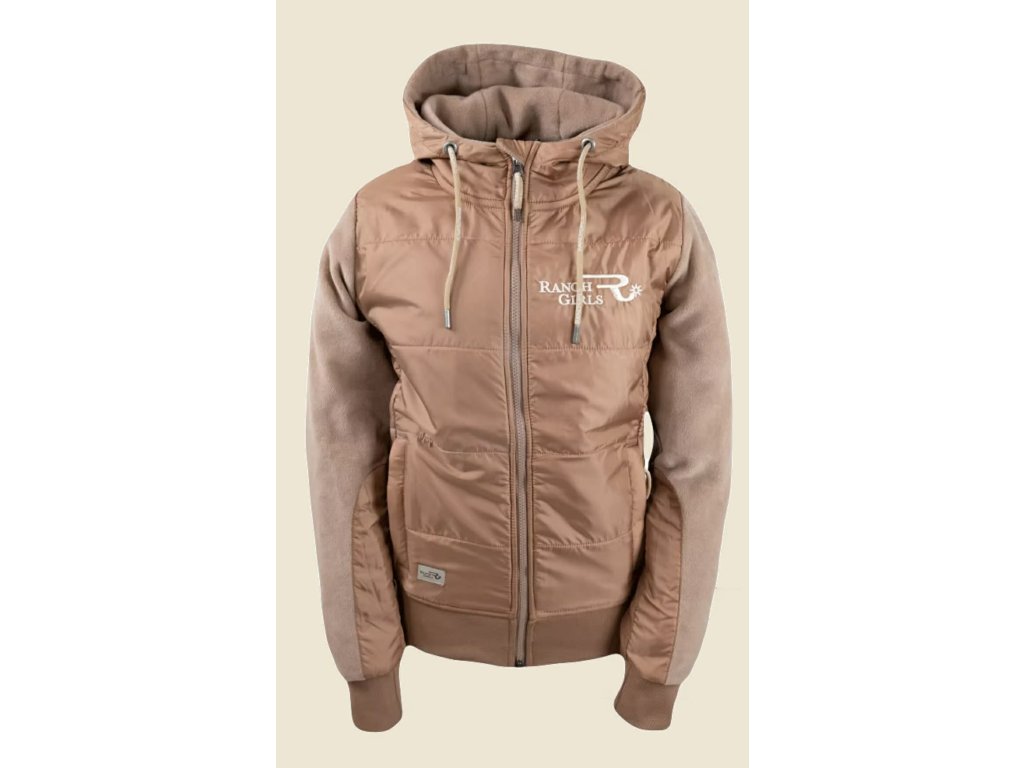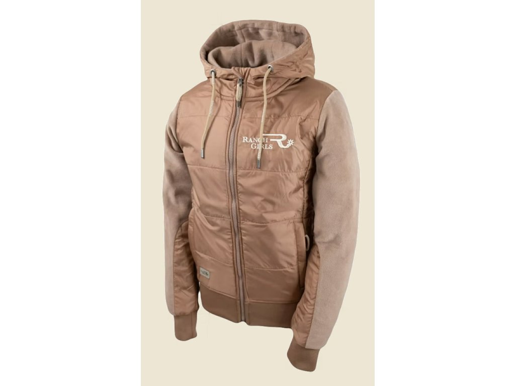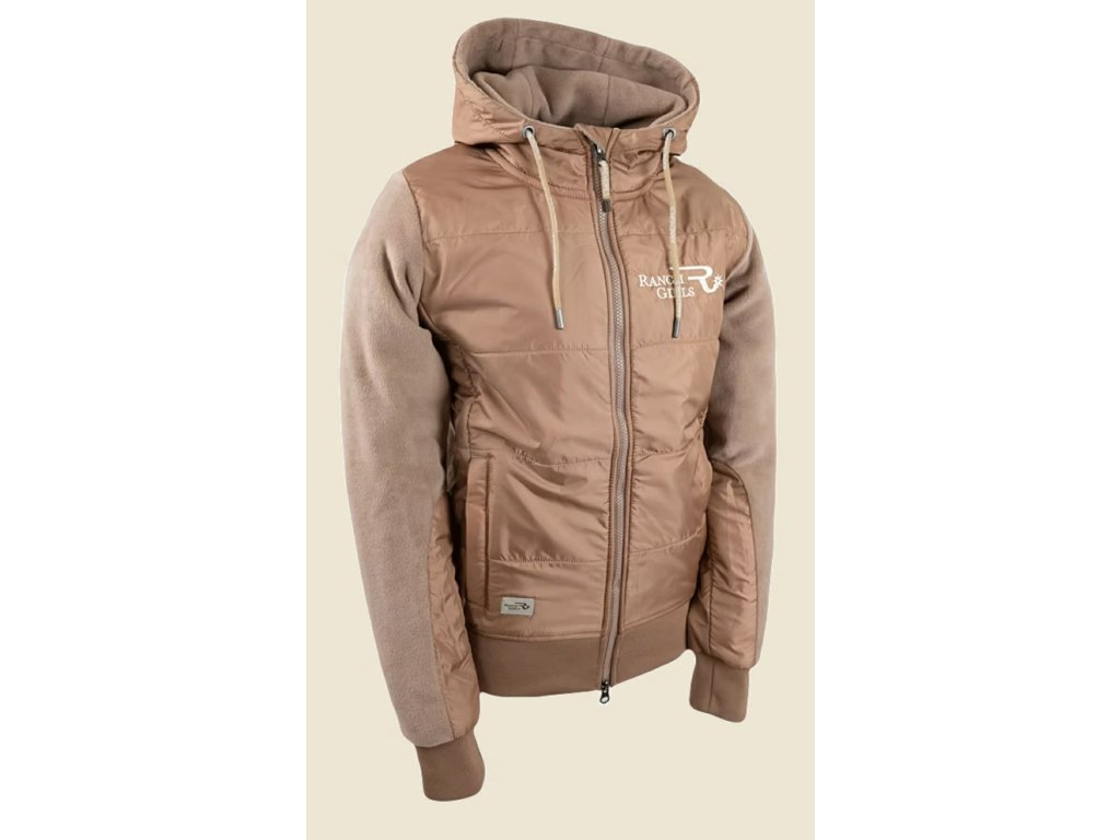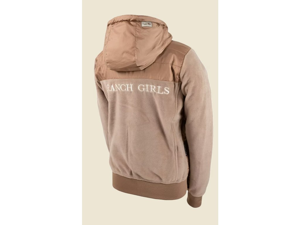 Neprekonateľná Ranch Girls Fleece Pro Shield bunda CAMILLA macchiato je tu. Predstavuje dokonalú kombináciu 330 g polar fleecu a nylonu. Nylonový materiál – na prednej časti tela, kapucni a v oblasti lopatiek – spoľahlivo chráni pred vetrom a dažďom.