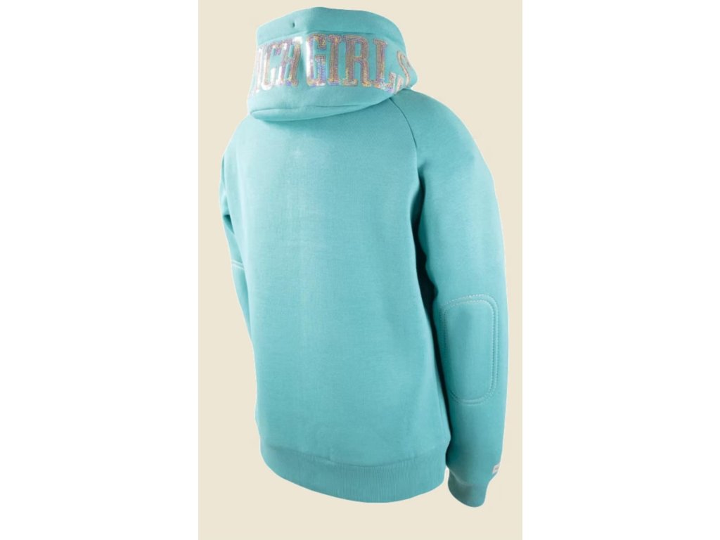 Raglánový strih ponúka maximálnu voľnosť pohybu a dĺžka rukávov je ideálne prispôsobená jazdkyniam. Flitrový dizajn na kapucni a hrudi robí z tejto mikiny skutočný pútač pozornosti. Malé vrecko na zips bezpečne uloží kľúče alebo drobné nevyhnutnosti počas jazdenia.