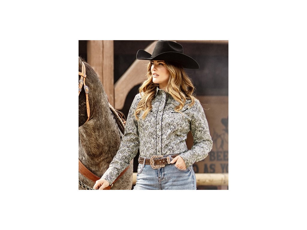 Táto pôvabná westernová blúzka je zdobená detailným paisley vzorom v decentnej kombinácii sivej a modrej farby. Typická westernová jarmo časť, ozdobné „smiley“ vrecká, manžety so 4 cvočkami a tmavé lemovanie dodávajú košeli klasický cowgirl vzhľad.