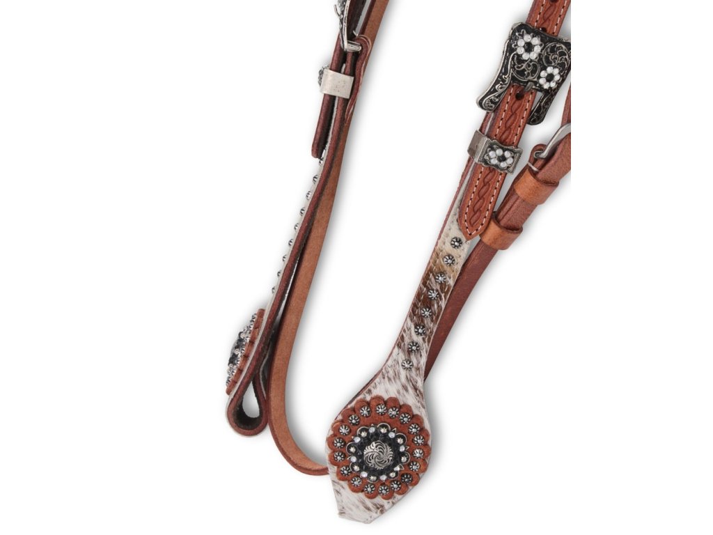 ✔️ vyrobená z kvalitnej, pevnej kože v elegantnom tmavom odtieni ✔️ originálny dizajn lícnic zdobený pravou srsťou – každý kus je jedinečný ✔️ veľké strieborné conchos so žiarivými kamienkami ✔️ Two Ear štýl s podhrdelníkom pre bezpečné a stabilné uchytenie ✔️ ušné pútka zdobené čierno-bielymi kamienkami ✔️ bohato gravírované strieborné pracky s kamienkami ✔️ ideálna na westernové disciplíny, show, reining aj pleasure jazdenie