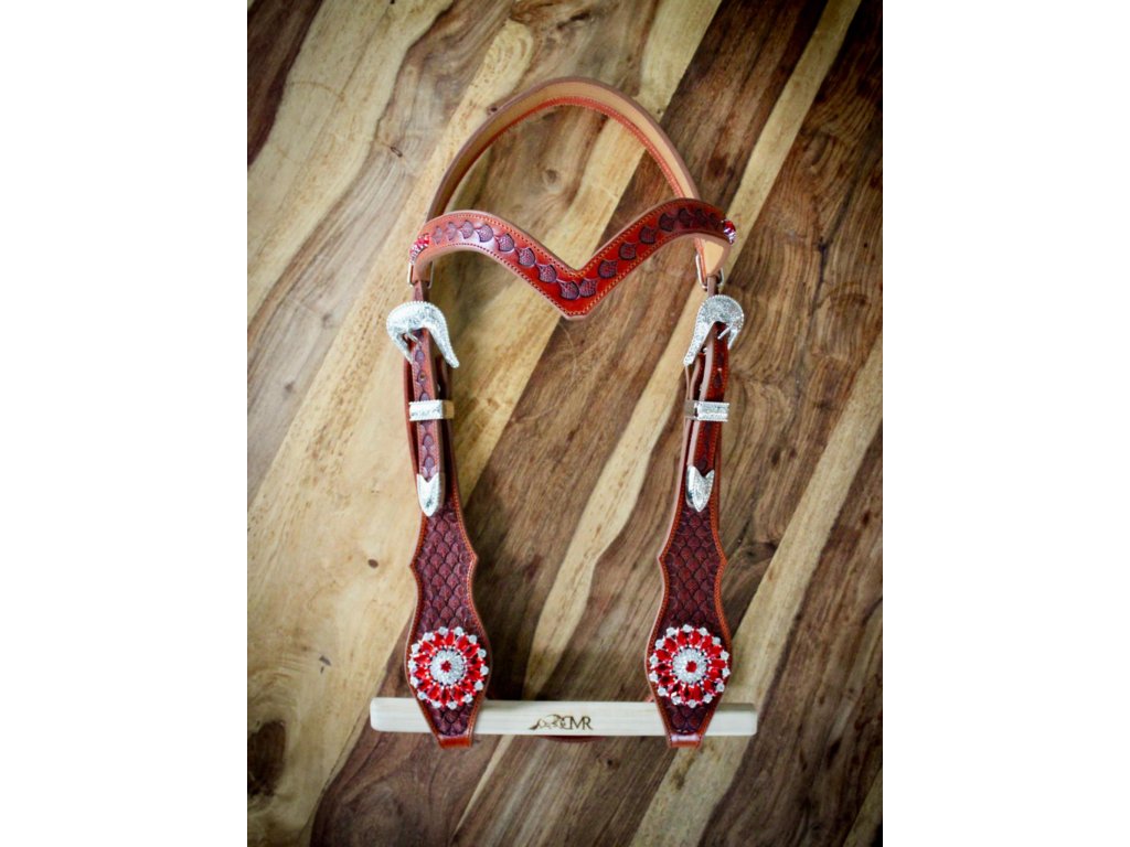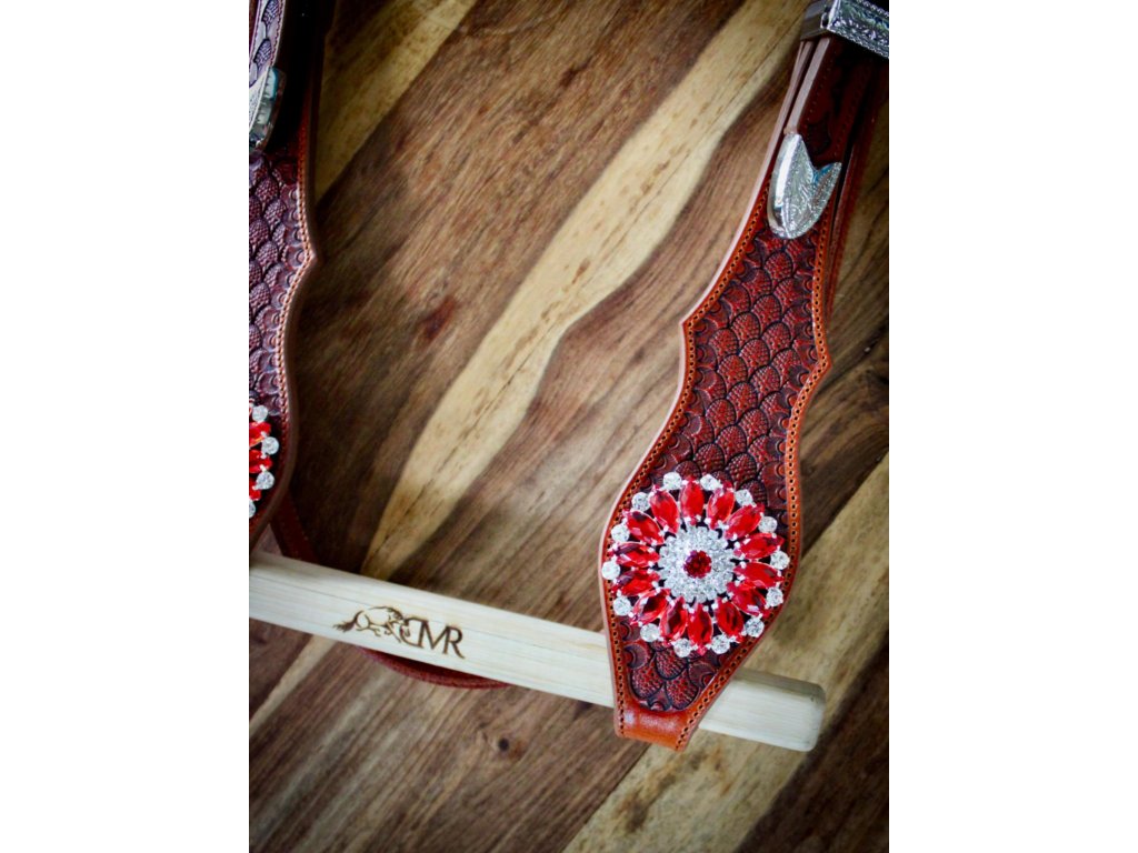 Pravá talianska koža, precízne ručné spracovanie a detailné zdobenie v odtieňoch červenej a striebornej robia z tohto modelu skutočný šperk pre vášho koňa.